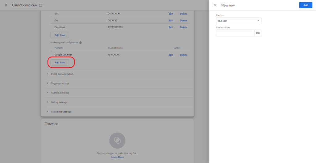 Almost all websites are using marketing tools that are aiding their efforts, like Google Optimize, Optinmonster, Hotjar, Hubspot to name just a few of the most frequent ones. While you can install these outside of the ClientConscious tag if you want to, it is a lot more beneficial to do it from here. You only have to choose the platform that you wish to use, add the platform id into Pixel attributes and save. No need to care about loading order, triggers etc and adding these platfroms from here comes with some extra advantages compared to adding them through the regular GTM setup that we discuss below.