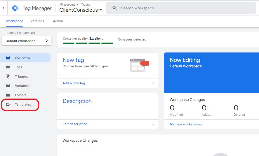 Please download the GTM template that we provide and save it your computer. Open a GTM container that’s present on your website and open Templates from the left menu.