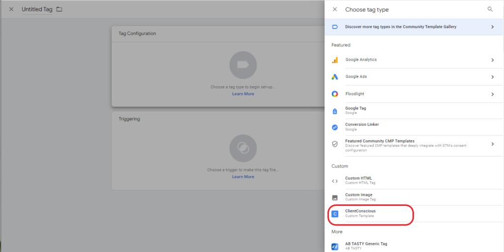 Import the template file (ClientConscious.tpl) from where you have saved it on your computer and then click save. From this point on you only need to create a GTM Tag as you regularly would.