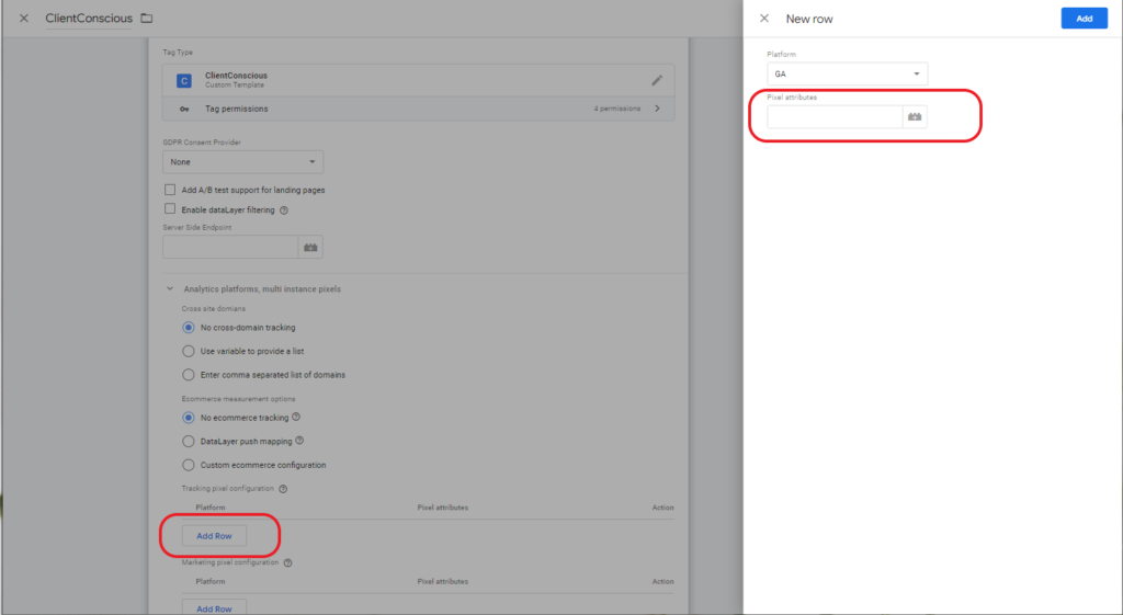 Within the tag click “Add row” under tracking pixel configuration, choose GA as the platform and add your GA4 measurement id into Pixel attributes.