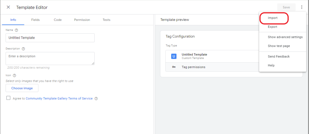 Click the New button next to Tag Templates and once template editor opens click on import under the three dots in the right-side menu.