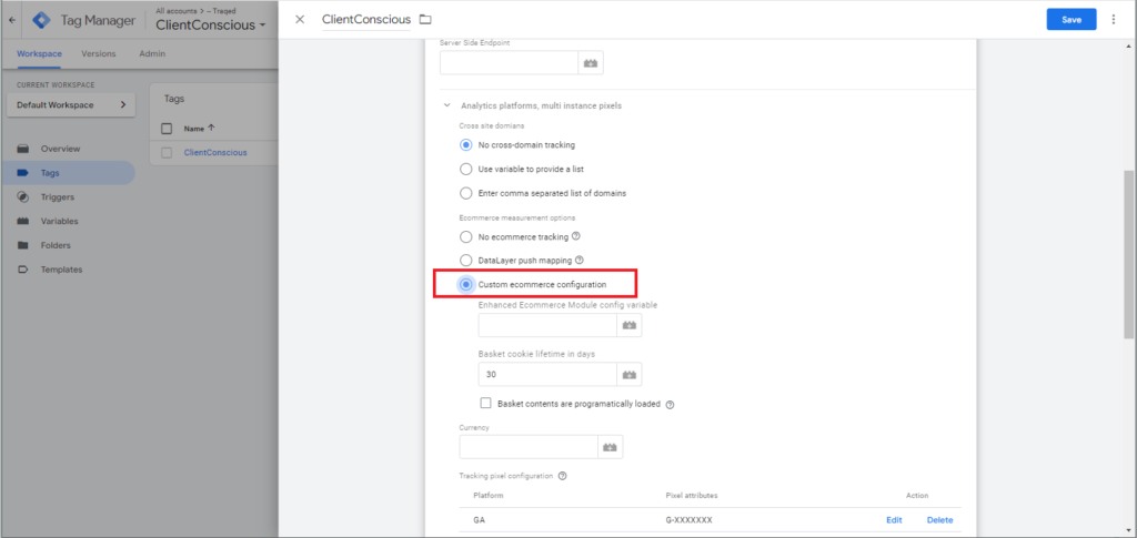 First you need to select “Custom ecommerce configuration” under “Ecommerce measurement options” in your ClientConscious tag for ecom options to be visible.