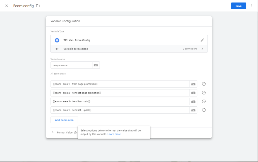 The topmost setting that became visible by selecting “Custom ecommerce configuration” is “Enhanced Ecommerce Module config variable”. This field expects an Ecom config variable which you can create form the custom varible template that we provide. This template collects settings for all ecom areas throughout your website. You simply need to add all ecom configurations to this variable. Details follow further down.