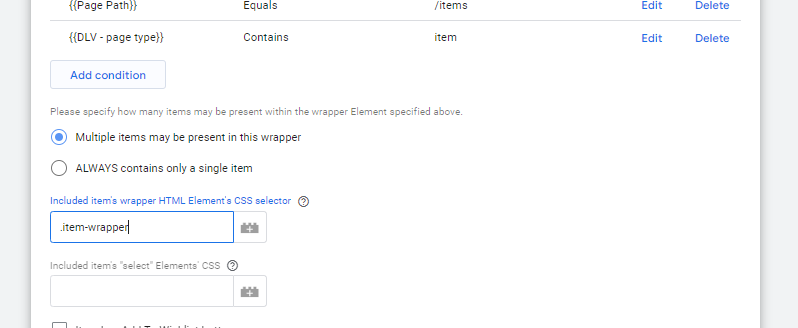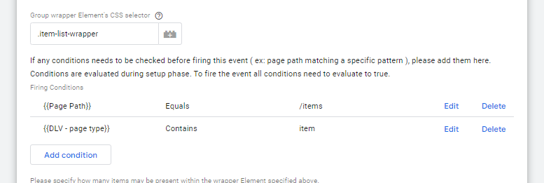 Once you have specified the selector for the group ( product list or promotion items ) wrapper element, the next field that you can interact with is “Firing conditions”. You can add any number of conditions here that are all going to be checked to be true for the list tagging to be active on the page.