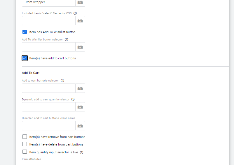 If you add quantity to this table of item attributes and you specify it by adding a CSS selector, and the item specified by the selector contains the actual in-cart quantity for the product, then you do not need to specify cart action button selectors individually, but you can simply check the “Item quantity input selector is live” box right above this table. Whenever the value within the element specified by the quantity selector changes it will trigger an add to cart or a remove from cart event with the amount of the most recent value update.